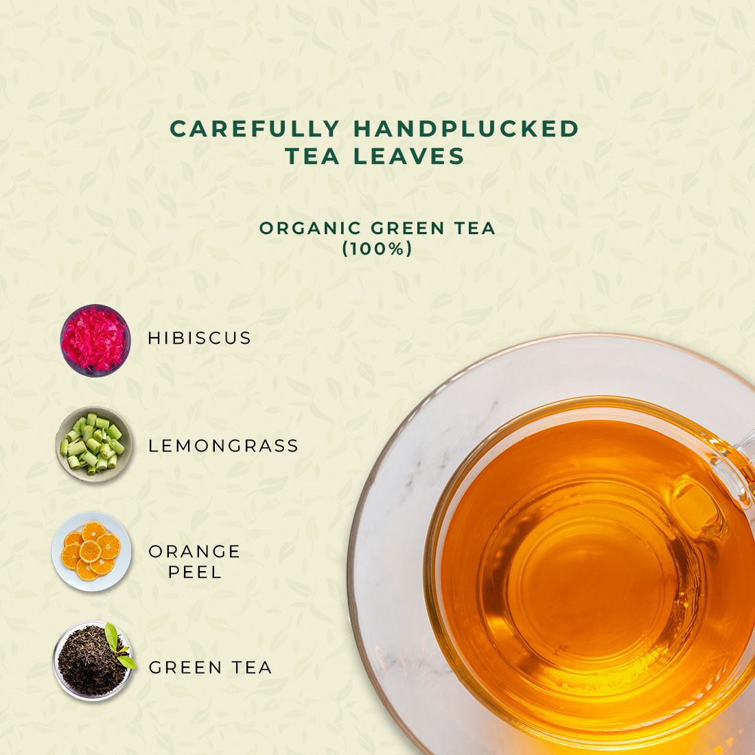 It’s a zesty, floral blend of green tea, hibiscus, lemongrass, and orange peel crafted to refresh and rejuvenate.