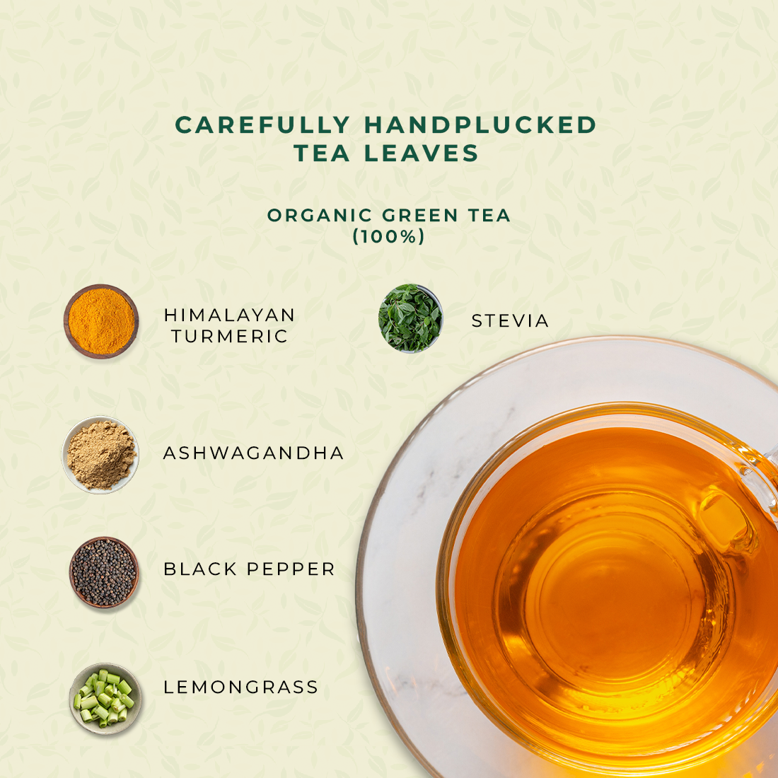 Discover holistic wellness in a cup with our Turmeric Ashwagandha Green Tea, a blend inspired by ancient Ayurvedic traditions. Crafted with the finest ingredients, it brings together the golden warmth of turmeric, the strength of ashwagandha, and the freshness of lemongrass for a soothing yet revitalizing tea experience.
